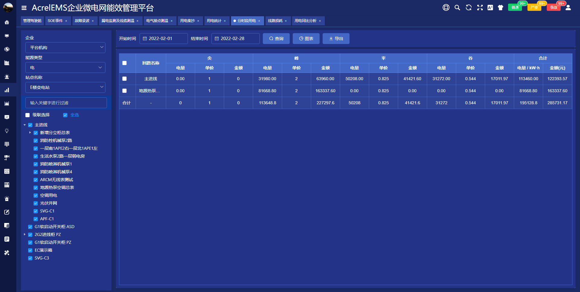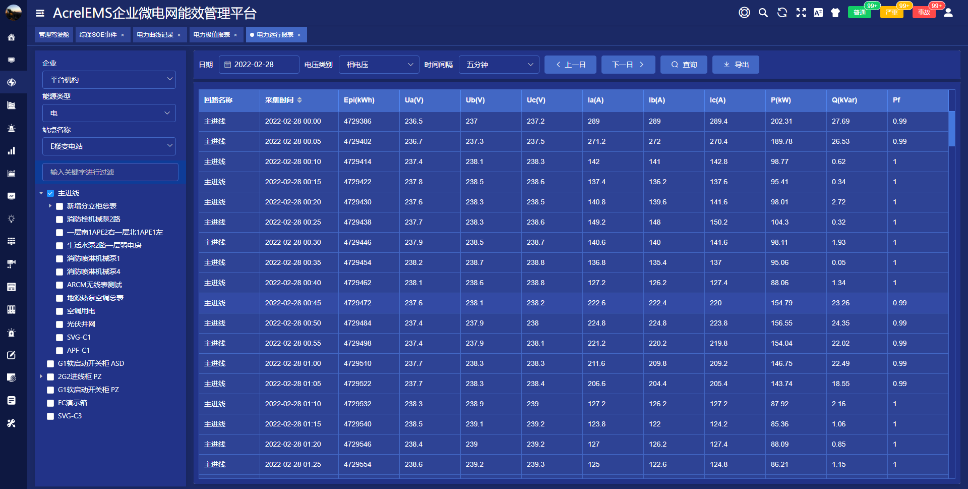 查询各回路或设备指定时间的运行参数,报表中显示电参量信息应包括:各相电流、三相电压、总功率因数、总有功功率、总无功功率、正向有功电能等.