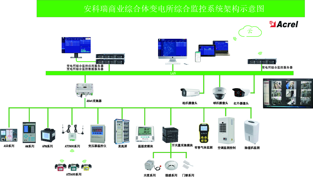 Acrel-2000E配电室综合监控系统,可实现开关柜运行监控、高压开关柜带电显示、母线及电缆测温监测、环境温湿度监测、有害气体监测、安防监控,可对灯光、风机、除湿机、空调控制等设备进行联动控制。实现动力环境各数据的检测与设备控制,优化动力环境,避免运行环境的失控导致配电设备运行故障,保证维护人员安全,延长设备使用寿命,实现配电动力环境的分布式远程管理。