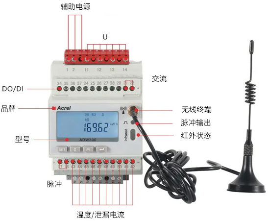 ADW300无线计量仪表主要用于计量低压网络的三相有功电能,具有RS485通讯和470MHz无线通讯功能,方便用户进行用电监测、集抄和管理。可灵活安装于配电箱内,实现对不同区域和不同负荷的分项电能计量,统计和分析。