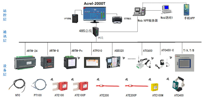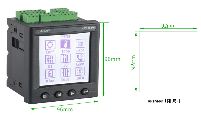 ARTM-Pn无线测温装置:ARTM-Pn无线测温装置可以单独安装在高压柜、低压抽屉柜内,每台装置可以接收18个传感器的数据,传感器型号可选配ATE100、ATE200、ATE300。装置带有一路485接口,可将采集到的温度数据上传到监控中心。