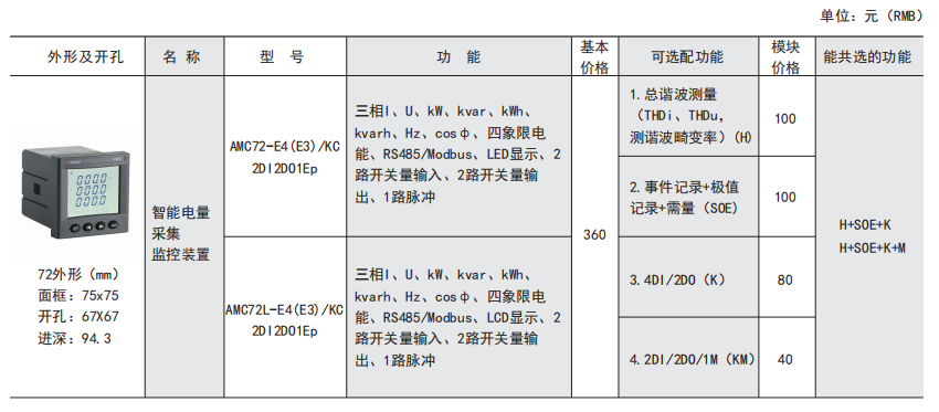 AMC 系列可编程智能电测仪表是针对电力系统、工矿企业、公用设施、智能大厦的电力监控需求而设计的智能仪表,它集成电力参数的测量(如单相或者三相的电流、电压、有功功率、无功功率、视在功率、频率、功率因数)以及电能监测和考核管理。采用高亮度 LED/LCD 显示界面,通过按键来实现参数设置和控制,非常适用于实时电力监控系统。可以直接取代常规电力变送器及测量仪表。作为一种智能化、数字化的前端采集元件,该仪表已广泛应用于各种控制系统、SCADA 系统和能源管理系统中。