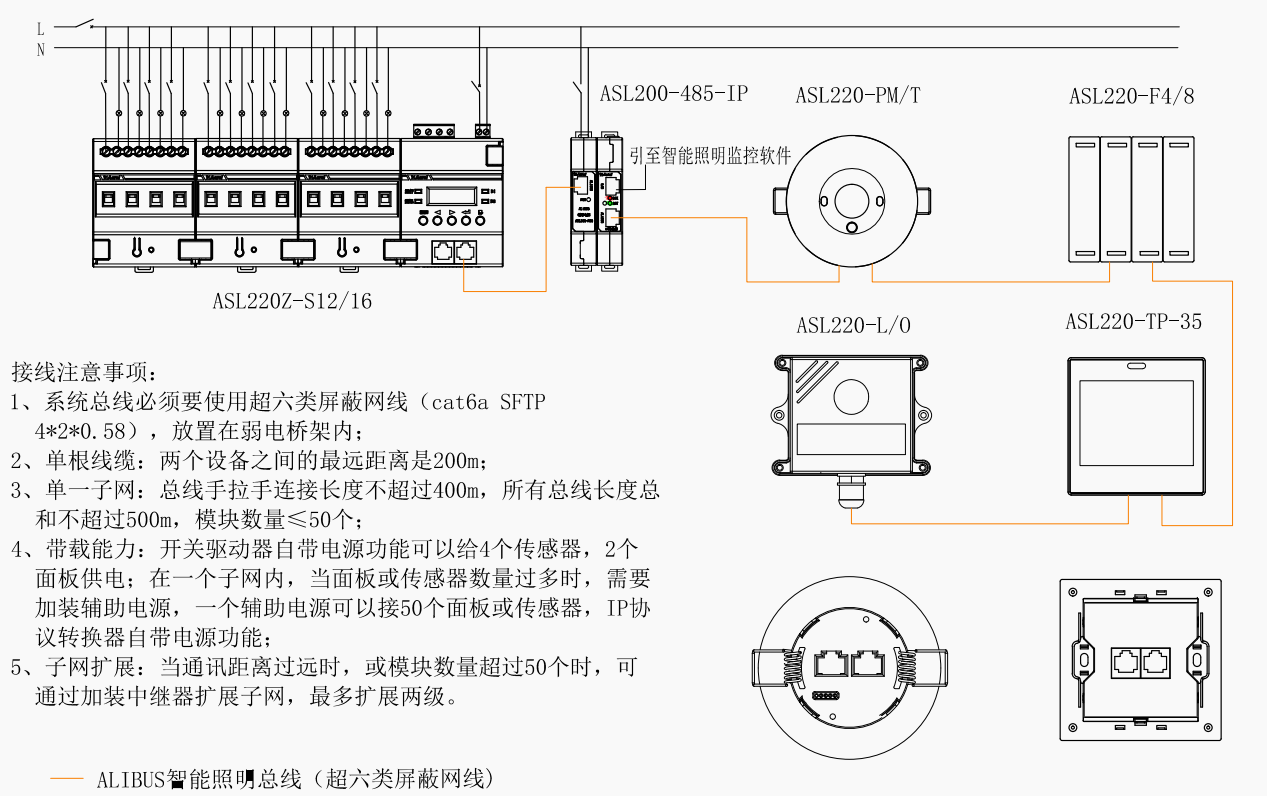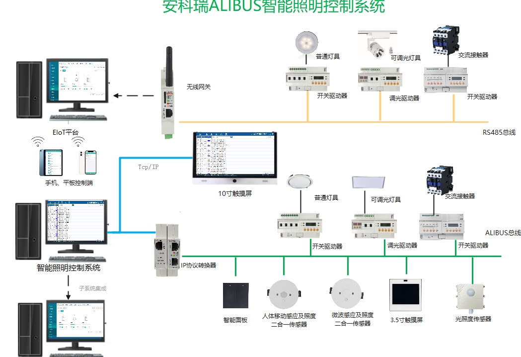 ALIBUS智能照明控制系统是安科瑞新一代自有知识产权的照明控制解决方案,基于成熟的RS485通讯控制技术。同时创新地引入了载波侦听和冲突碰撞检测机制,多机间的实现了实时双向通讯。线材使用的超六类屏蔽网线,一次性解决通讯与供电问题。整个系统由输出设备、输入设备和系统元件。输出设备负责接收和处理传感器传送的信号,并执行相应的操作,如开/ 关灯、调节灯的亮度。输入设备负责根据现场手动操作,或探测光线、人体运动等变化,向驱动器发出相应的控制信号。系统元件主要负责搭建系统平台,如IP协议转换器、中继器等。