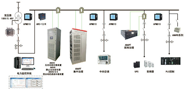 ANAPF系列有源电力滤波器通过电流互感器采集系统谐波电流,经控制器快速计算并提取各次谐波电流的含量,产生谐波电流指令,通过功率执行器件产生与谐波电流幅值相等方向相反的补偿电流,并注入电力系统中,从而抵消非线性负载所产生的谐波电流。