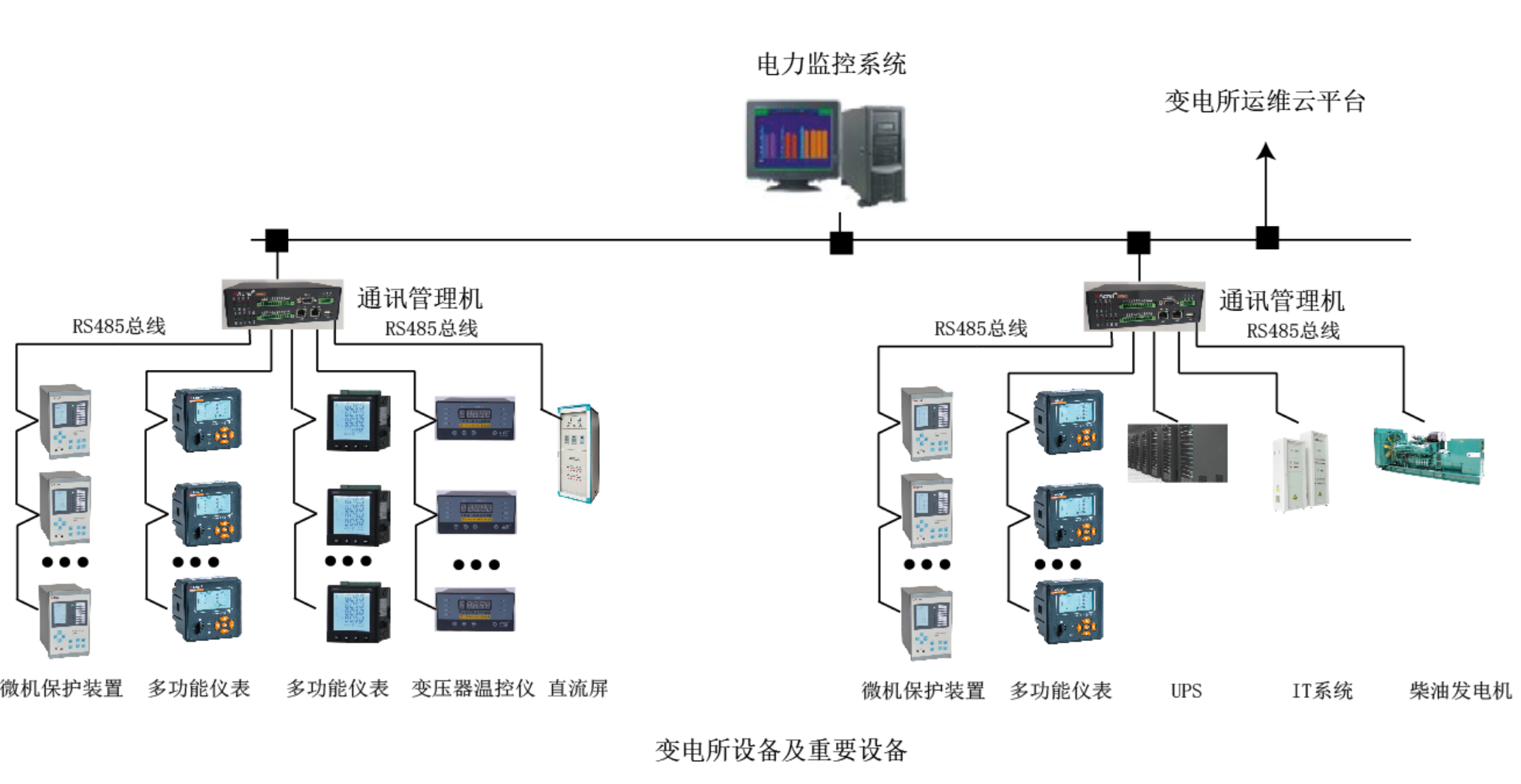 系统采用分布式结构,微机保护装置、多功能仪表、变压器温控器、直流屏、柴油发电机控制屏等设备通过RS485总线或者以太网接入智能网关,经过协议转换、数据处理后上传至电力监控系统,实现遥测、遥信、遥控、异常报警等功能。