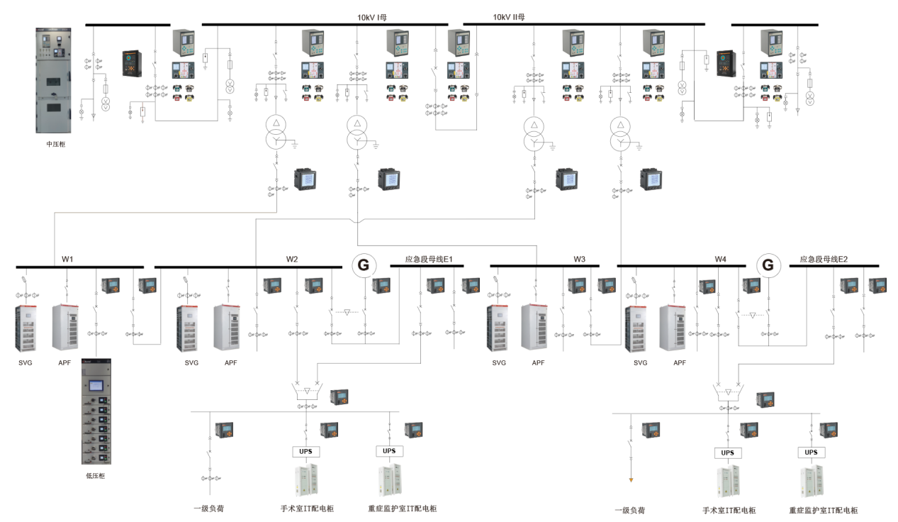 电力监控系统主要针对开闭所和10/0.4kV变电所,对高压回路配置微机保护装置及多功能仪表进行保护和监控,对0.4kV出线配置多功能计量仪表,用于测控出线回路电气参数和用能情况。同时对医院重要设备如柴油发电机、无功补偿装置、有源滤波装置、UPS、隔离电源系统状态进行监测。