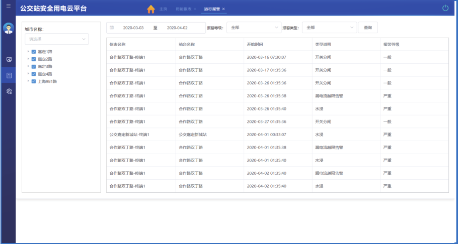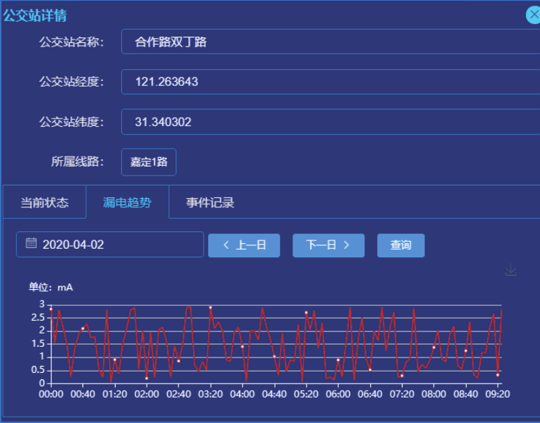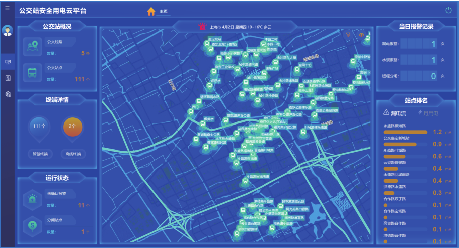 通过在公交站配电箱安装安全用电监测终端,实时监测公交车站配电系统漏电电流及水浸状态,并将监测数据通过移动网络上传至云端服务器。管理人员可通过手机APP、短信及时接收现场的异常报警信息。安全用电监测终端可以接收平台控制指令,在天气恶劣时远程断开公交站电源以确保安全。控制命令可以单独控制某个公交车站,也可以根据公交线路或者区域集群控制,提高管理效率。