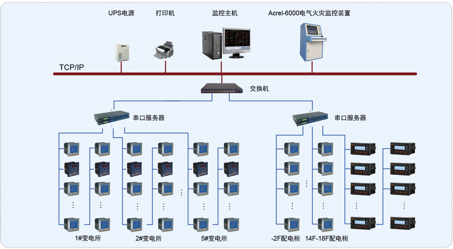 本项目采用Acrel-6000电气火灾监控系统,监控范围主要为处于地下室的低压配电间和各个楼层中的配电柜。客户系统需求为探测漏电电流、过电流、超温度等信号,发出声光信号报警,准确报出故障线路地址,监视故障点的变化。储存各种故障和操作试验信号,显示系统电源状态。