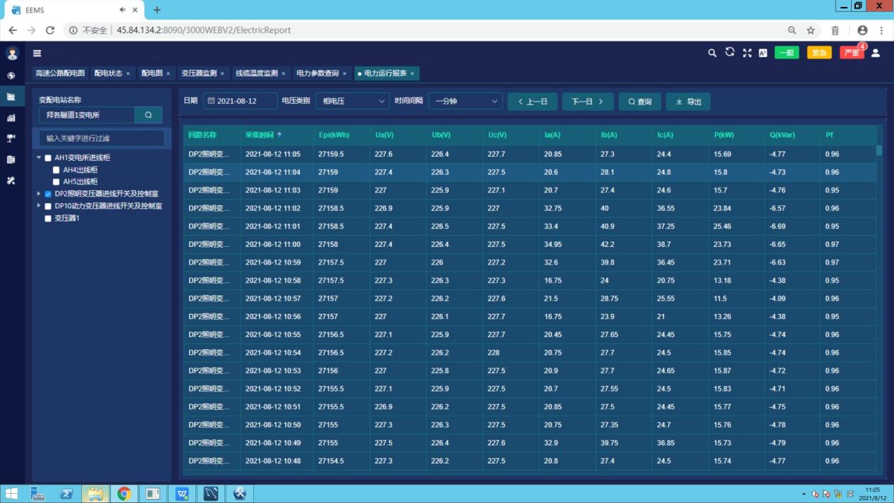 查询各回路或设备指定时间的运行参数,报表中显示电参量信息应包括:各相电流、三相电压、总功率因数、总有功功率、总无功功率、正向有功电能等.