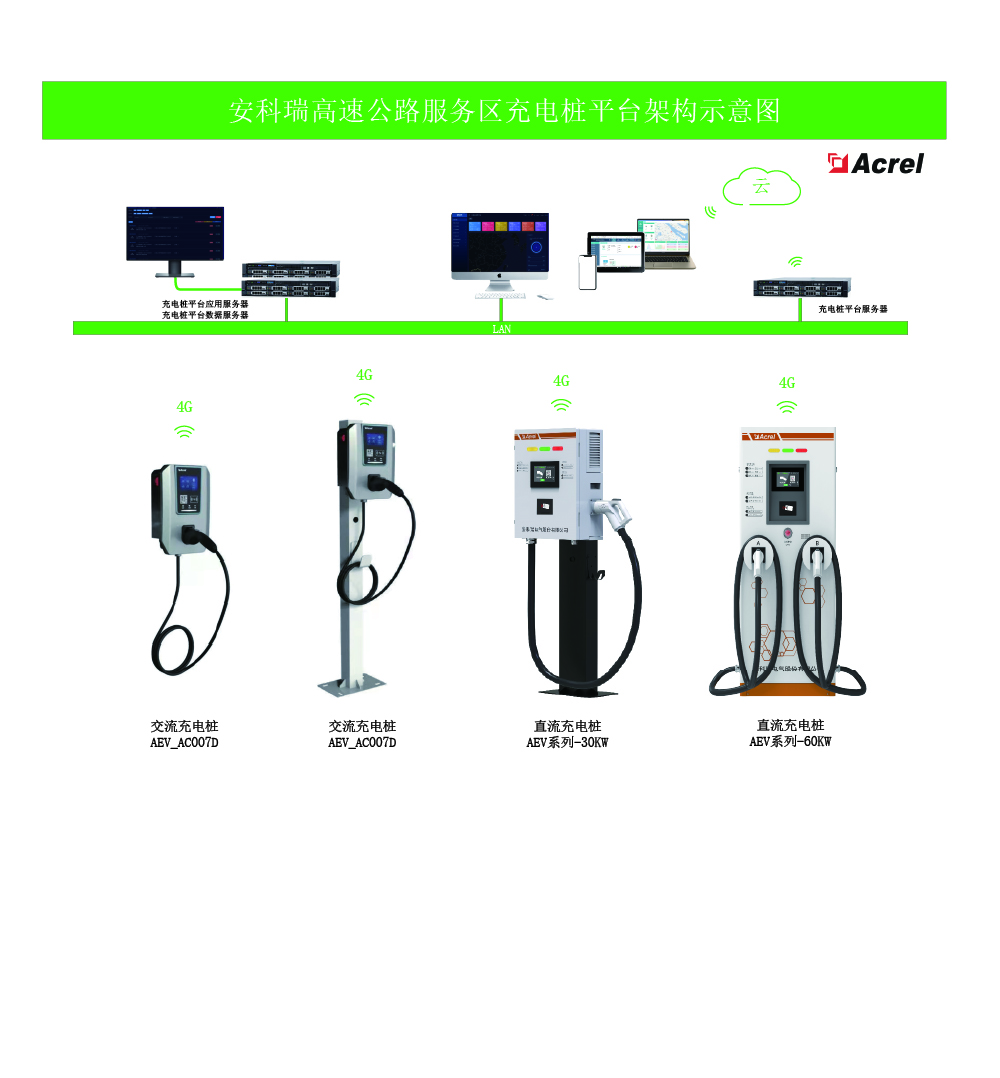 由于近年来新能源电动汽车的普及,高速公路服务区需要提供充电桩为其进行充电。充电桩管理系统通过物联网技术对接入系统的充电桩站点和各个充电桩进行不间断地数据采集和监控,解决用高速用电管理部门对充电桩监控问题。电动汽车支持IC卡和扫码充电方式。远程充电桩系统可实时远程完成启动充电、强制停止、单价设置等控制指令,用户可通过APP、微信、支付宝小程序扫描二维码,进行支付后,系统发起充电请求,控制二维码对应的充电桩完成电动汽车的充电过程。同时对各类故障如充电机过温保护、充电机输入输出过压、欠压、绝缘检测故障等一系列故障进行预警;能够远程控制,提供财务报表和数据分析等功能。