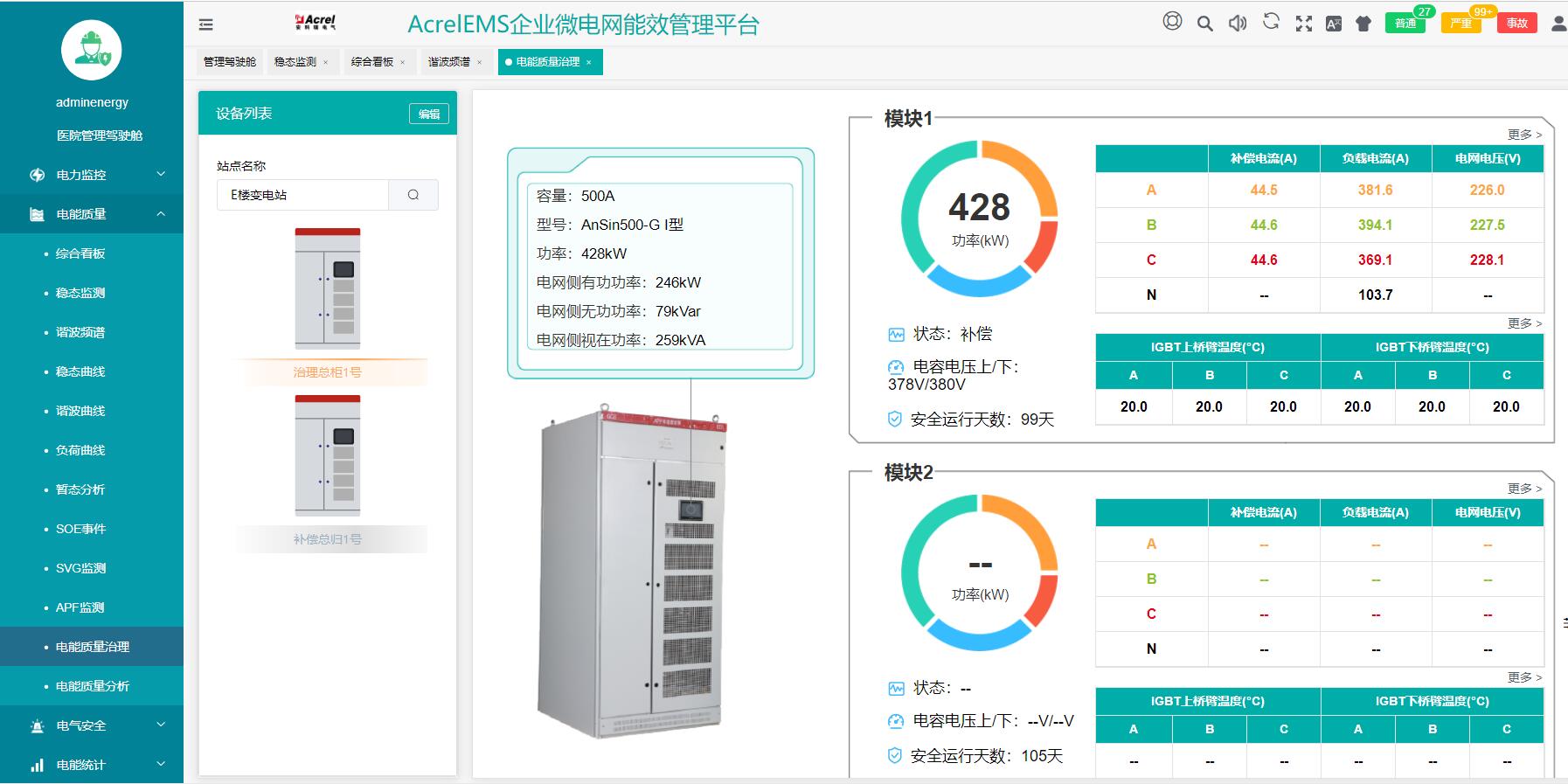 显示有源滤波和无功补偿装置运行情况,包括补偿电流、负荷电流,电网电压,IGBT上下桥臂温度等。